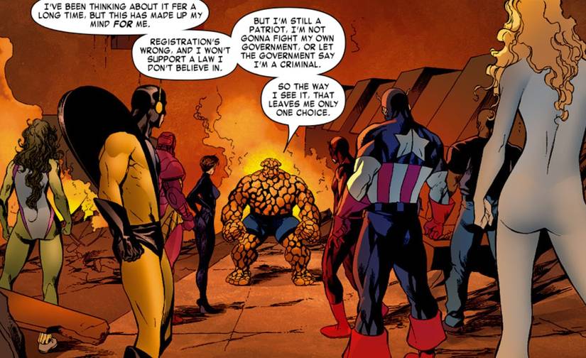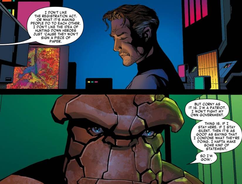 Lo que hace que la posición de la cosa sea particularmente conmovedora es el hecho de que desafió lo que todos los demás héroes, especialmente sus propios compañeros de equipo fantásticos, esperaban de él. El señor Fantástico, en particular, fue uno de los defensores más fuertes de la Ley de registro sobrehumano a pesar de las preocupaciones de su familia. Reed trabajó en estrecha colaboración con Iron Man y desempeñó un papel vital en la orquesta del plan para atrapar a los héroes que no se registraron en la zona negativa. Como tal, Ben Grimm se enfrentó a la presión para alinearse con su mejor amigo, pero en cambio se puso firme y se abandonó de los Cuatro Fantásticos para mantener sus manos limpias del desastre que Reed estaba haciendo.