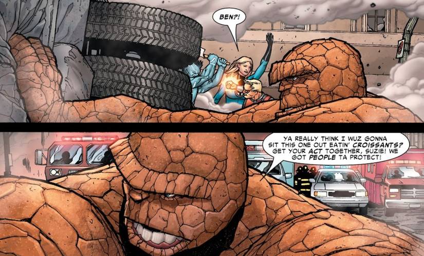 Esta escena, más que cualquier otra, revela por qué Ben Grimm es considerado por muchos como el corazón y el alma de los Cuatro Fantásticos. Incluso cuando todos sus amigos peleaban en diferentes lados de una guerra, lo que dejó de lado eso y entró en la refriega para echarles una mano. La lealtad de Ben a su familia venció a sus preocupaciones sobre ser considerado un traidor a su país, transmitiendo así lo profundamente que se preocupa por los cuatro fantásticos, e ilustra su incapacidad para dejar que un error no se cuestione. A lo largo y delgado, la cosa siempre estará allí cuando los cuatro fantásticos lo necesiten más.