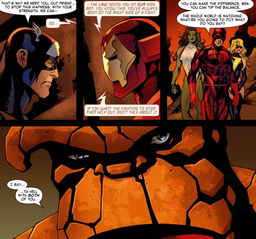 En Cuatro fantásticos #539 por J. Michael Straczynski, Adi Granov y Mike McKone, la cosa quedó atrapada en el medio de la Guerra Civil que estaba gestando entre dos mitades de la comunidad de héroes. Ambas partes cuestionaron a Ben sobre de qué lado estaba en la disputa de registro sobrehumana, y él respondió diciendo: “Ta infierno con los dos”.