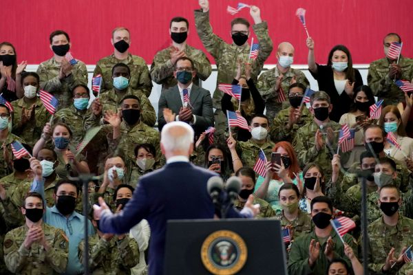 “Este es mi primer viaje al extranjero como presidente de Estados Unidos. Me dirijo al G7, luego a la ministerial de la OTAN y después a reunirme con el señor Putin para hacerle saber lo que quiero que sepa”, dijo Biden, provocando los vítores de las tropas.