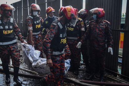Los bomberos rescatan cuerpos de víctimas tras el incendio en una fábrica de Bangladés, este viernes.MUNIR UZ ZAMAN / AFP