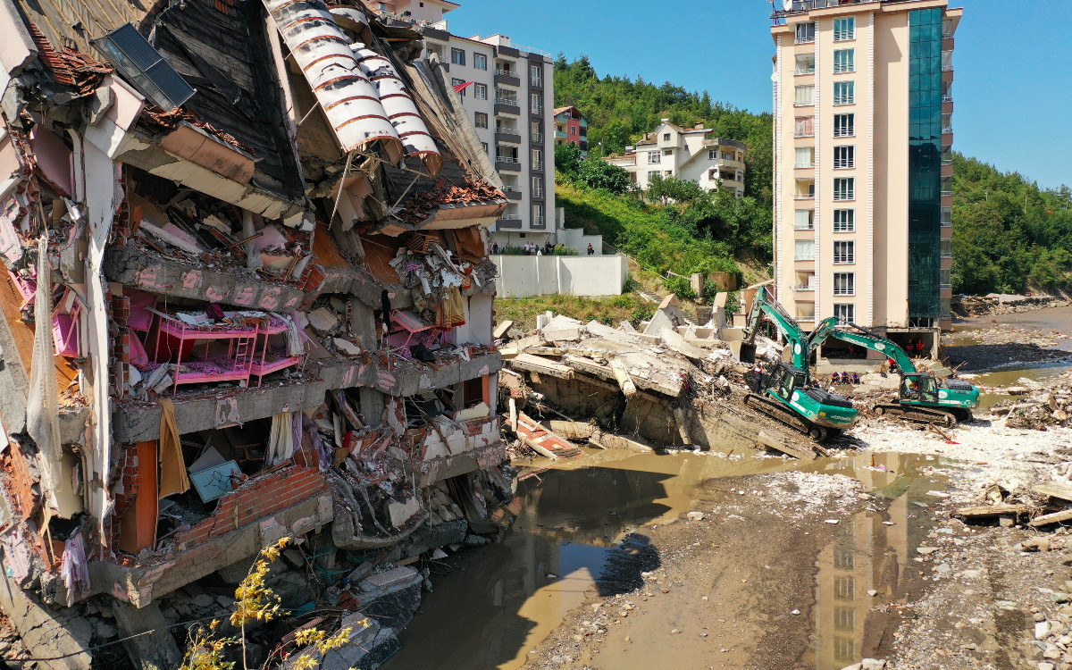 Imágenes de drones obtenidas por Reuters mostraron daños masivos en la ciudad de Bozkurt, en el Mar Negro, afectada por las inundaciones, donde los trabajadores de emergencia buscaban entre los edificios destruidos.