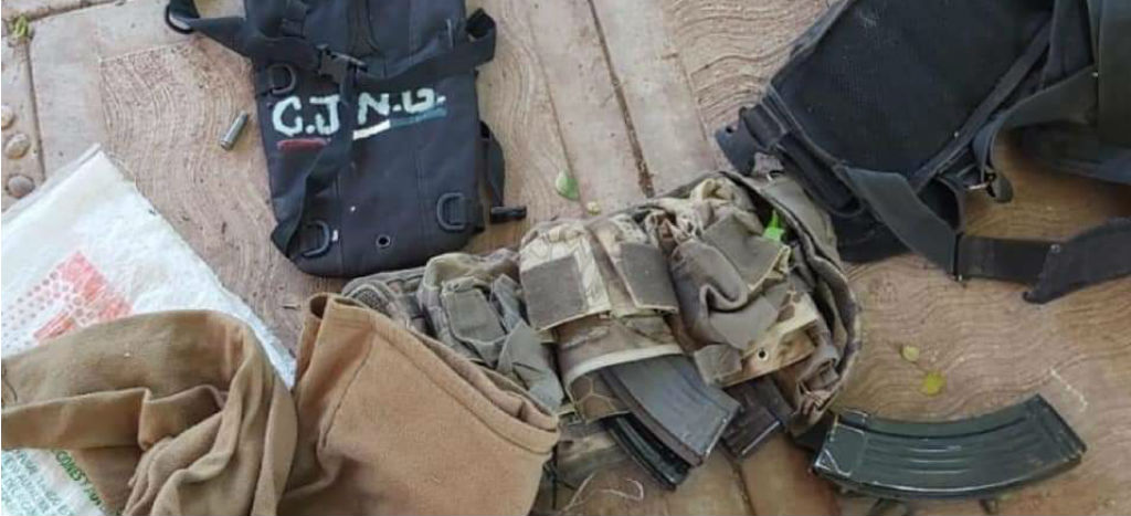 Esta casa de seguridad se encuentra ubicada en el poblado de Pinzanangapio en el que además, encontraron chalecos tácticos, fornituras y gorras con la leyenda “CJNG”.