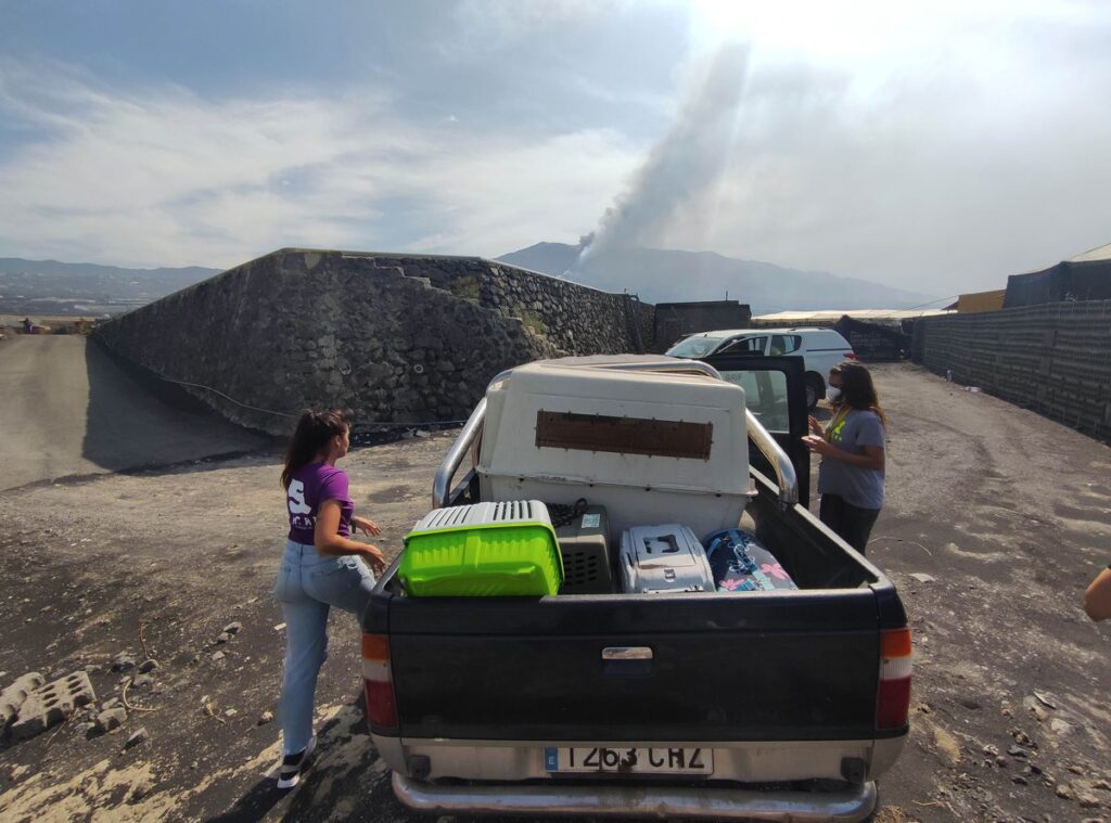 La misión de Cecilia y Lara, ambas de 28 años, es encontrar a un podenco “salvaje” que lleva días merodeando por una finca de plátanos ya evacuada en la zona de La Laguna. Ambas son voluntarias de la protectora Siacan desde que explosionó el volcán. “Si lo ven, no le den de comer, retoma energías y es imposible pillarlo”, le dice Cecilia a uno de los policías del primer puesto de control de un barrio que fue desalojado hace ya más de una semana. Van subidas en una camioneta provista de diferentes tipos de pienso para animales, agua, trasportines de diversos tamaños y hasta uno específico para gallinas. A la irradiación del sol se suma el calor que desprende la lava, a poca distancia. Visten ropa deportiva y ambas llevan el pelo recogido en una coleta alta, que se deshacen a ratos. “Bueno, aquí está Lara animalitos”, le dice uno de los operarios de protección civil en el segundo de los controles. Ellas no piensan en el peligro del volcán, solo tienen en la cabeza ser rápidas y rescatar al máximo número de animales.