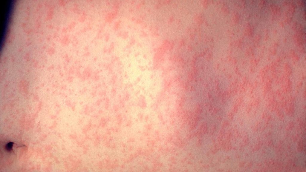 El sarampión suele comenzar con fiebre alta y varios días después aparece una erupción en el rostro que se extiende al resto del cuerpo. Entre las complicaciones serias, a 1 de cada 20 pacientes les da neumonía, y 1 de cada 1,000 sufre de inflamación del cerebro, que puede provocar convulsiones, sordera o discapacidad intelectual.