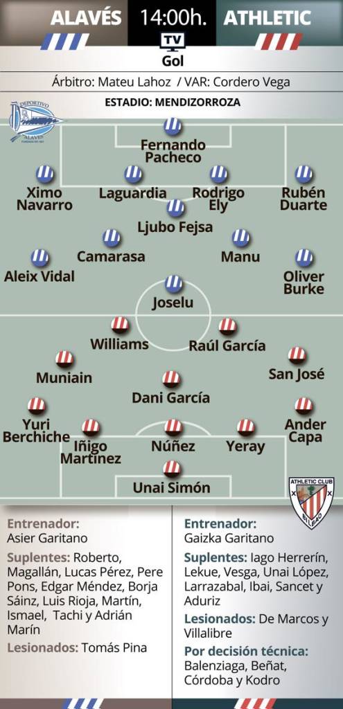 Es posible que Gaizka Garitano repita con el esquema de tres centrales que le venía dando buenos resultados a los bilbaínos hasta la derrota con Osasuna. Sería la respuesta lógica para verse las caras con un Alavés que tiene a dos delanteros que llevan sembrando el terror a las defensas rivales a lo largo de la campaña. Lucas Pérez y Joselu suman nueve tantos por cabeza y están sosteniendo al conjunto babazorro.