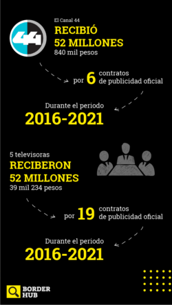 Durante el mismo periodo, el Municipio otorgó otros 19 contratos a cinco televisoras locales por un monto total de 52 millones 039 mil 234 pesos, es decir, que Canal 44 recibió 800 mil 766 pesos más que todas las televisoras juntas, demostrando así un favoritismo por la empresa de sus padres.