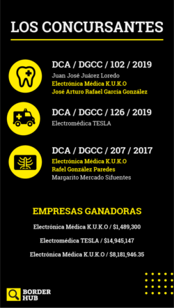 La licitación del contrato DCA/DGCC/102/2019 para la compra de equipo médico dental tuvo como participantes a la empresa Electrónica Médica K.U.K.O. y a José Arturo Rafel García Chávez, este último es a su vez accionista de K.U.K.O.