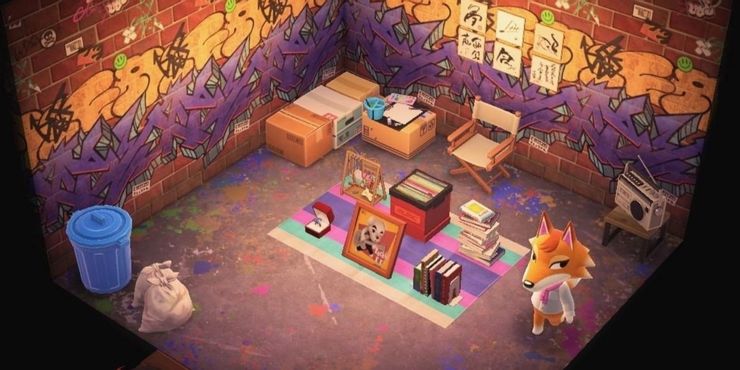 Hablando de espacios de vida llenos de basura, la casa del jefe del aldeano lobo malhumorado podría funcionar como un lugar emergente en el callejón de un vendedor ambulante. Con un fondo de pantalla de arte callejero, un bote de basura y cajas, muchos pueden ser escépticos en cuanto a dónde o cómo Chief obtuvo los artículos más valiosos en exhibición, como la caja de discos, el puesto de joyería y el anillo, este último cuesta 69,000 campanas en Nook’s Cranny. en Nuevos horizontes. Combinar esto con la apariencia de zorro de Chief no le hace ningún favor en términos de confiabilidad.
