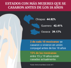 El Informe Anual México 2017 realizado por el Fondo de las Naciones Unidas para la Infancia (Unicef, por sus siglas en inglés) detalla que en México 23.6% de las mujeres han sido casadas o viven en unión conyugal antes de cumplir los 18 años. Los tres estados con mayor porcentaje son Chiapas (44.82 %), Guerrero (42.41) y, precisamente, Oaxaca (39.17%).