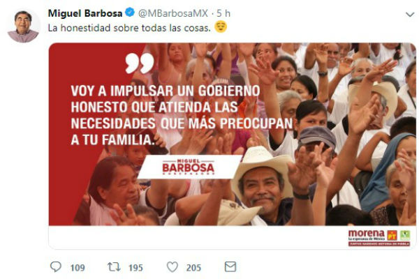 “Miguel Barbosa es impresentable, pone en riesgo el triunfo de Morena en Puebla, Morena no tiene la culpa de que este señor se haya enriquecido de manera inexplicable”, abundó.