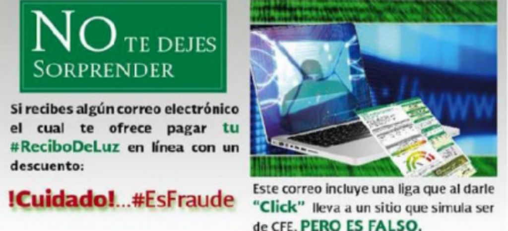 La Comisión Federal de Electricidad (CFE) informó que ha detectado el uso de correos electrónicos apócrifos que buscan engañar a los usuarios con supuestas notificaciones sobre su recibo, para obtener acceso e instalar códigos maliciosos en sus equipos de cómputo.