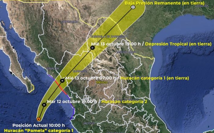 Esta mañana, Pamela se localizaba a 405 kilómetros al suroeste del puerto turístico Mazatlán y soplaba vientos máximos sostenidos de 130 km/h, con rachas más fuertes, mientras avanzaba a hacia el norte a 20 km/h, según datos del NHC.