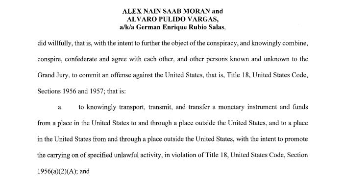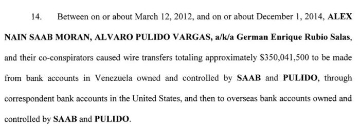 La acusación formal del caso detalla que, a partir de noviembre de 2011 o alrededor de esa fecha y hasta al menos septiembre de 2015, Saab y su cómplice, Álvaro Pulido Vargas, alias Germán Enrique Rubio Salas, conspiraron con otros para blanquear las ganancias de un esquema de soborno ilegal desde cuentas bancarias ubicadas en Venezuela hacia y a través de cuentas bancarias ubicadas en los Estados Unidos.