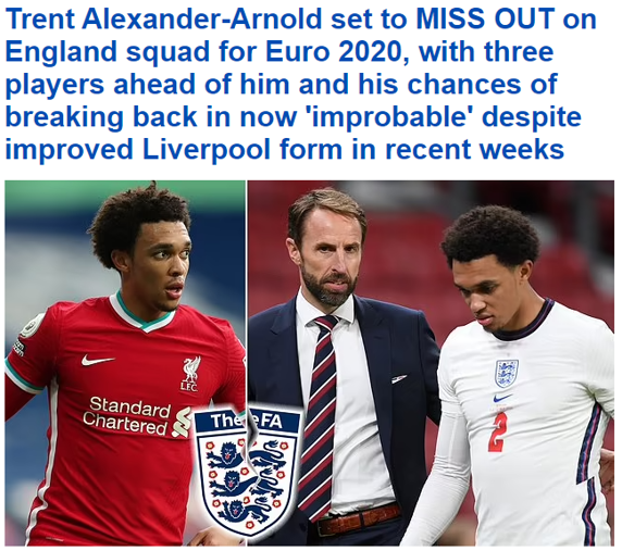 League, Trent debutó con la absoluta en junio de 2018 de la mano de un Southgate que después de dejarlo fuera de su última convocatoria declaró que “no ha jugado a su nivel habitual de los últimos años”. Desde octubre de 2020, hace ya más de siete meses, Alexander-Arnold no ha disputado ningún partido oficial con Inglaterra.