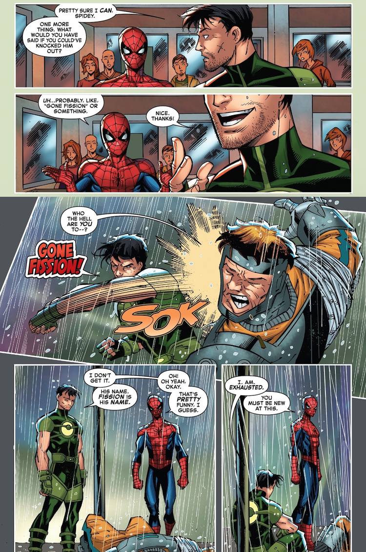 Retrocediendo en el tiempo para salvar a Fission de una muerte segura, Overtime le pregunta a Spider-Man qué diría en esa situación. Naturalmente, la respuesta de Spider-Man es un juego de palabras con el nombre del villano: “Se fue la fisión. ” Viajando un día atrás, Overtime da el golpe de gracia que salva el día junto con el remate, completamente fuera de contexto.Incluso Spider-Man está confundido y no entiende la ocurrencia. Cualquier maestro de los juegos de palabras sabe cómo esperar el comienzo de la broma, pero Overtime dice la ocurrencia sin venir a cuento. Spider-Man, un héroe y comediante veterano, comenta que Overtime debe ser nuevo en esto.