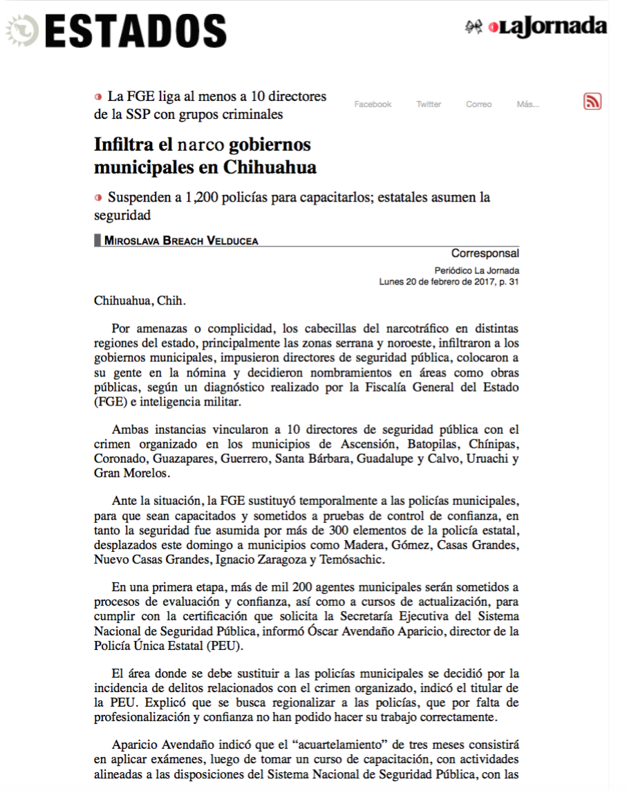 El último artículo sobre el tema, publicado en febrero de 2017, es probablemente el que le costó la vida. Titulado “Los cárteles se infiltran en los municipios de Chihuahua”, nombraba a los directores de seguridad pública vinculados con los grupos criminales y especialmente a la poderosa familia de Chínipas, y el jefe de la policía, también pariente de Los Salazares, Martín Ramírez Medina, a quien identificaba como un criminal.