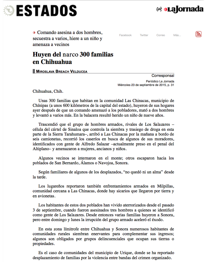 Los Salazares comenzaron a hacer evidente que no les gustaba que escribiera sobre ellos a partir de 2015. Se lo hicieron saber a partir de una nota que publicó sobre el desplazamiento forzado de cientos de personas por las disputas territoriales que el grupo tenía en Chínipas. A ella le indignó mucho que unos ancianos conocidos suyos habían tenido que abandonar su casa.
