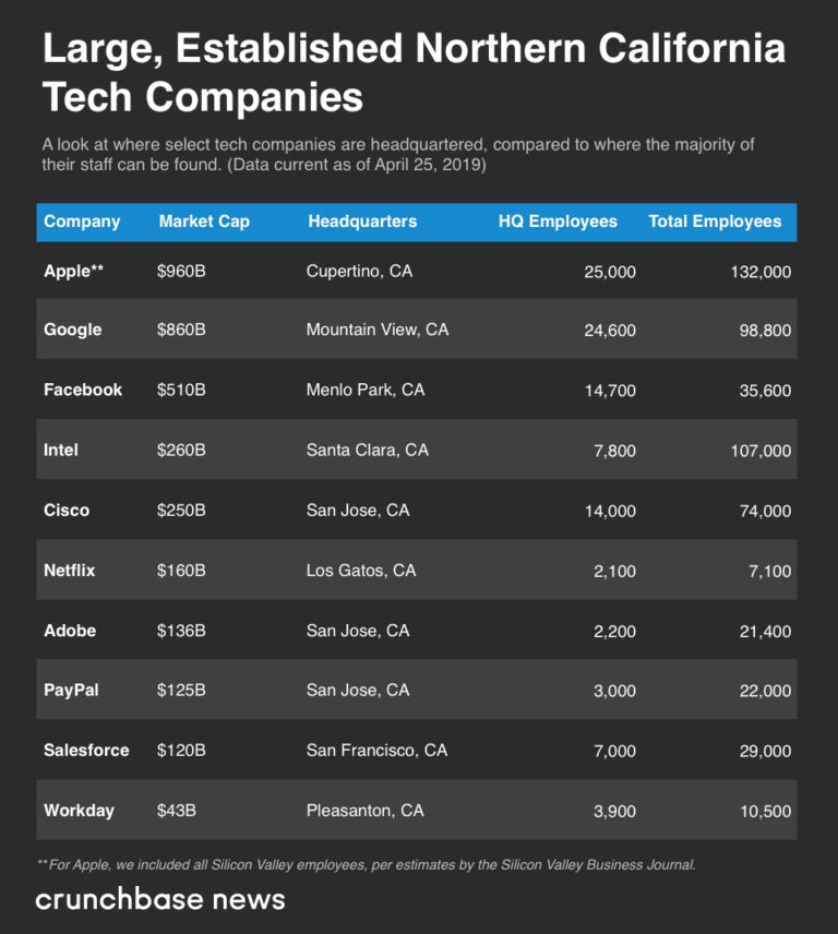 Entre las empresas de tecnología más grandes del norte de California, Crunchbase News encontró que la mayoría tiene menos del 25 por ciento de sus empleados a tiempo completo que trabajan en la ciudad donde tienen su sede. Presentamos los detalles de 10 de las empresas tecnológicas regionales más valiosas en la tabla a continuación.