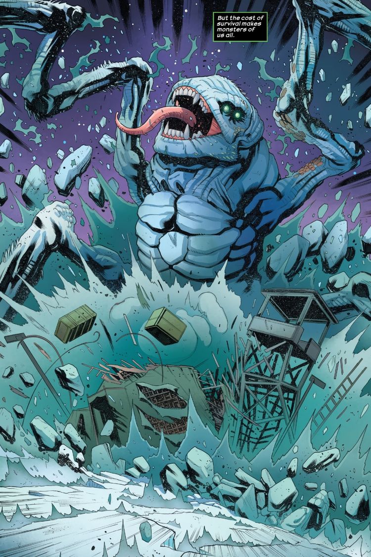 En Extraterrestre vol. 4 #3 Por Declan Shalvey y Andrea Broccardo, un equipo de recuperación de Weyland-Yutani en el LV-695 está intentando recuperar una embarcación que se perdió allí años antes. Sin embargo, encuentran algunos problemas cuando el barco que intentan sacar del agua helada queda infestado de Xenomorfos Blancos. Al final, el barco es destruido y la explosión resultante envía ondas de choque a través del océano, despertando a una bestia gigante que duerme bajo las profundidades heladas.