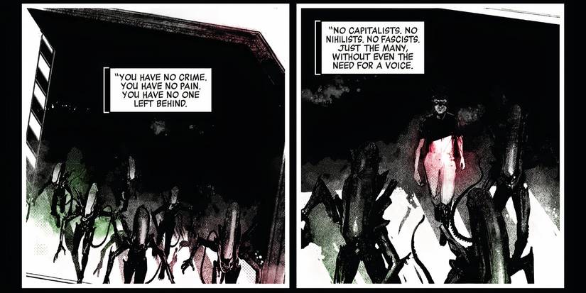 En el Alien: negro, blanco y sangre En la historia de cuatro partes “Utopía” de Collin Kelly, Jackson Lanzing y Michael Dowling, los lectores son testigos de la desgarradora historia de una colonia humana, dedicada a la igualdad total, que se desmorona por completo debido a una invasión xenomorfa. El barco autosuficiente, “Forward”, albergaba suficientes personas para colonizar un nuevo mundo al que tardaría aproximadamente 1.000 años en llegar. Pero después de que permitieron que una nave abandonada a la deriva en el espacio sin pasajeros excepto una Reina Xenomorfa atracara en su puerto, ningún humano vería este mundo: solo un Sintético y una colmena de Xenomorfos.