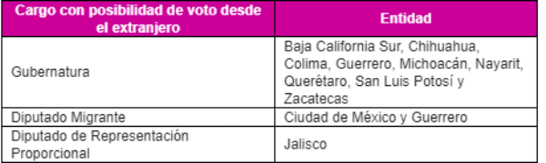 Las 11 entidades que podrían realizar el voto a través de Internet son:  Baja California Sur, Chihuahua, Colima, Guerrero, Michoacán, Nayarit, Querétaro, San Luis Potosí, Zacatecas, Ciudad de México y Jalisco.
