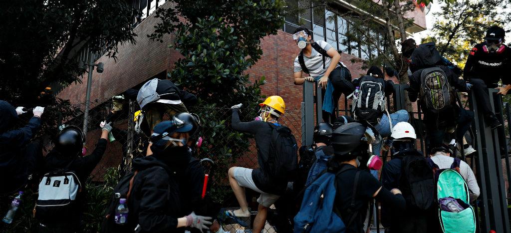 En un intento por desocupar el campus universitario, autoridades policiacas irrumpieron en las instalaciones de la Universidad Politécnica de Hong Kong con gas lacrimógeno y cañones de agua, a lo que los manifestantes respondieron con bombas incendiarias, ladrillos y flechas en un enfrentamiento que culminó en la madrugada.