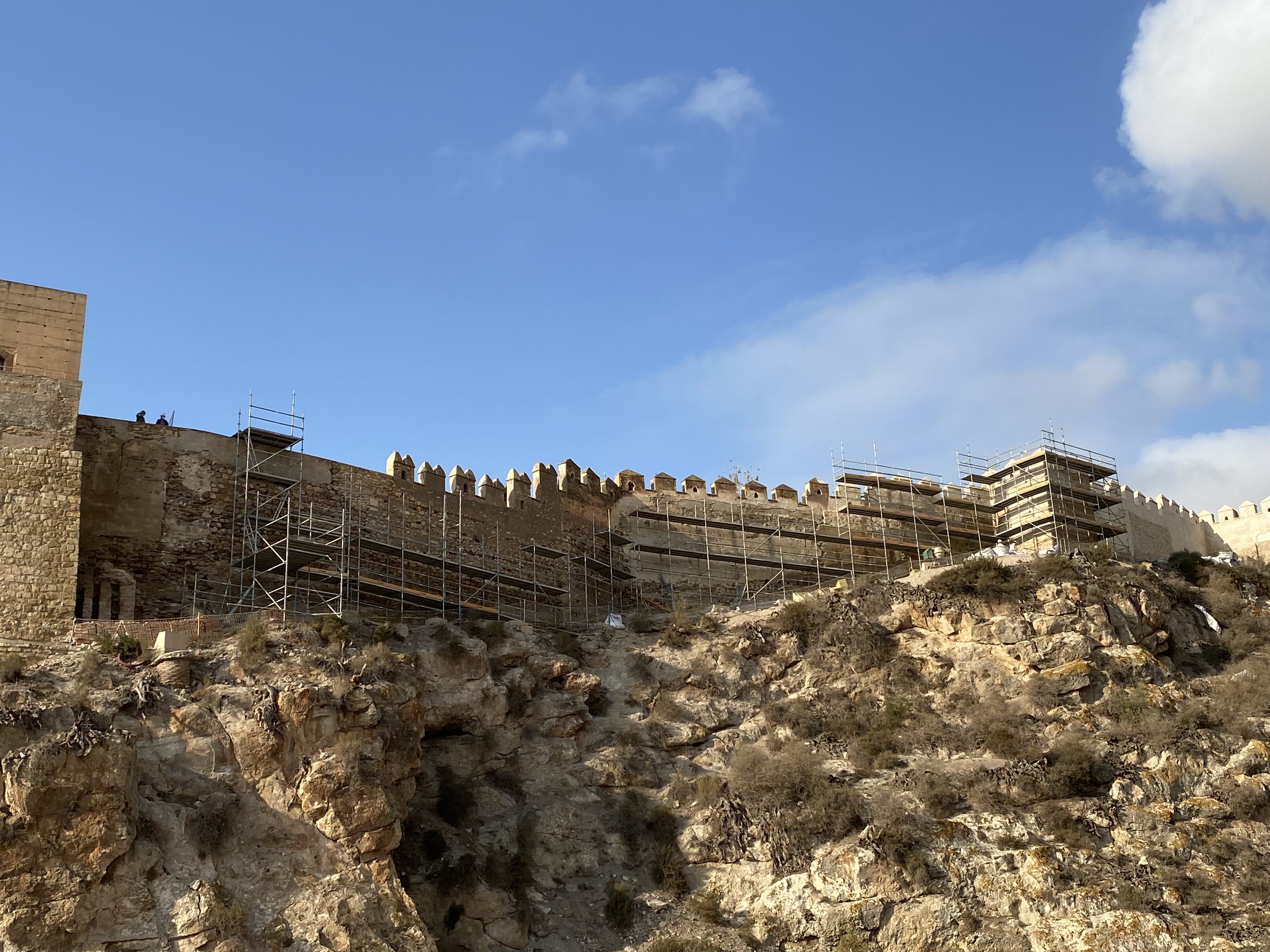 Con un entorno poco urbanizado en la actualidad, la alcazaba de Almería —monumento más visitado de la provincia, con 255.000 personas en 2019— refleja el esplendor de la antigua ciudad y ofrece preciosas panorámicas de la actual, con el barrio de La Chanca y el Mediterráneo a sus pies. Con un perímetro de casi kilómetro y medio, fue levantada en el siglo X sobre un antiguo asentamiento emiral dos siglos anterior en un alto cerro cercano al puerto, el más importante de Al-Ándalus. Cuenta con enormes murallas que protegían primero a los gobernantes y, después, a los residentes. Llegó al siglo XX con uso militar. Y, en estado ruinoso, pasó a manos públicas tras la Guerra Civil. Entonces se restauró durante cuatro décadas. Bajo la batuta del arquitecto Prieto-Moreno, se inventaron elegantes jardines por los que ahora corre el agua y se camufla el camaleón, se reconstruyeron edificios por completo y se enfatizó el color ocre en las murallas. Querían replicar la Alhambra.
