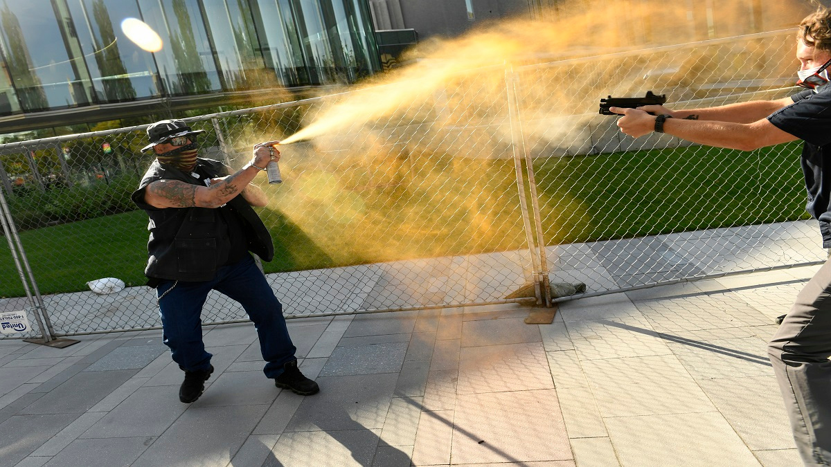 En el centro de la ciudad, se llevaban a cabo dos manifestaciones en la tarde del sábado, una denominada “Patriot Muster”, de grupos de extrema derecha, y otra llamada “BLM-Antifa Soup Drive”.
