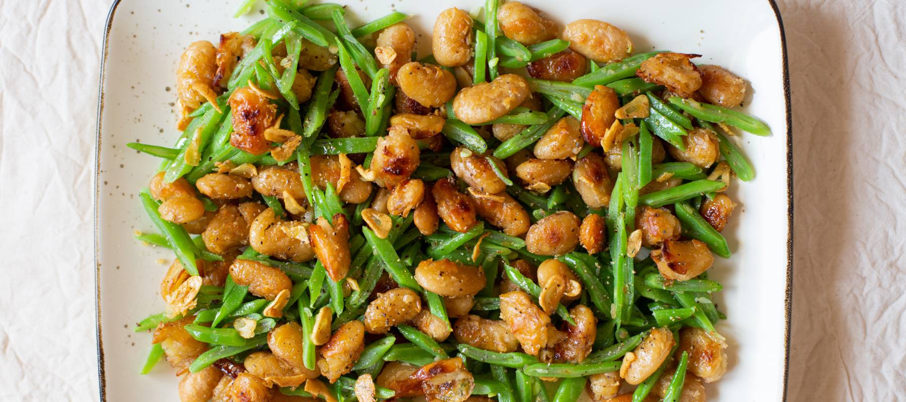 Hornear las legumbres de bote para que queden doradas y crujientes es otra práctica que vale la pena apuntar en el recetario. Combinadas con una o varias verduras son un triunfo asegurado, con una relación precio-tiempo-dificultad-resultado más que satisfactorio. Mientras las alubias, en este caso, están en el horno durante media hora, preparamos las judías verdes y el ajo. De la misma manera que cueces judías, podrías aprovechar ese tiempo para saltear otros vegetales como calabacín, tomates cherry, berenjena, cebolla o puerro, por ejemplo. La receta es completamente adaptable a los gustos y la disponibilidad del producto.