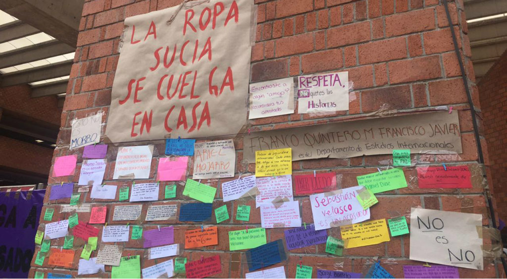Alumnas de la Universidad Iberoamericana en la Ciudad de México realizaron un “tendedero del acoso”, bajo el lema “denuncia a tu acosador”, para visibilizar los casos de presunto acoso y abuso sexual al interior de la institución.