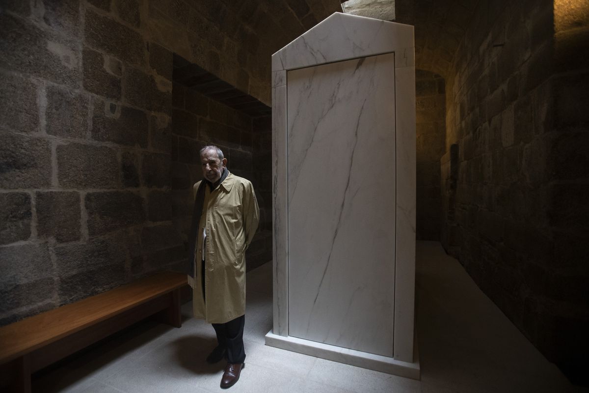 El arquitecto habla entusiasmado de esta oportunidad que le brindó la catedral de Santiago. Asegura que para él es “un sueño” firmar en este momento de su vida, cuando ya ha llevado a cabo tantos proyectos, esta obra “espiritual” y diferente. En el túmulo, las gruesas planchas de mármol se engarzan sin herrajes ni ningún tipo de elemento metálico. Al acto lo acompañaba el marmolista que se encargó de fabricar las piezas, transportarlas desde Portugal y montarlas en el viejo almacén que ahora es una capilla más entre las que están a su lado, la de la Comunión y la del Cristo de Burgos.