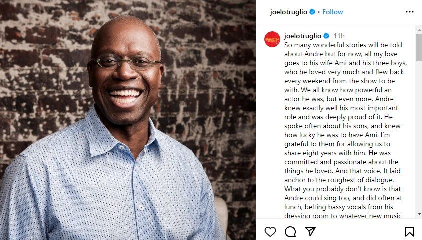 “Como todos los que tuvimos la suerte de conocer a Andre, estamos desconsolados por la noticia de su fallecimiento. Era uno de los actores dramáticos más talentosos de la historia, y luego decidió probar la comedia y al instante se convirtió en una de las personas más divertidas en hacerlo. Pero incluso mayor que su talento como actor fue la felicidad y la alegría que trajo a quienes lo rodeaban. Y su sonrisa… tenía la sonrisa más grande, más brillante y más maravillosa. Nuestros pensamientos y amor están para su hermosa y maravillosa familia, a quienes amaba más que a nada. Estamos agradecidos por el tiempo que pasamos con él”.