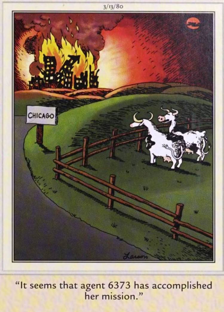 El lado lejano no es ajeno a mostrar un giro único en los eventos históricos, que es el caso en esta tira cómica, donde Dos vacas miran a Chicago en llamas y comentan que el Agente 6373 ha realizado su misión – dejado en claro por la decimación de la ciudad. El incendio es claramente el gran incendio de Chicago, que fue una conflagración que afectó a la ciudad en 1871 que devastó una gran parte de la ciudad.