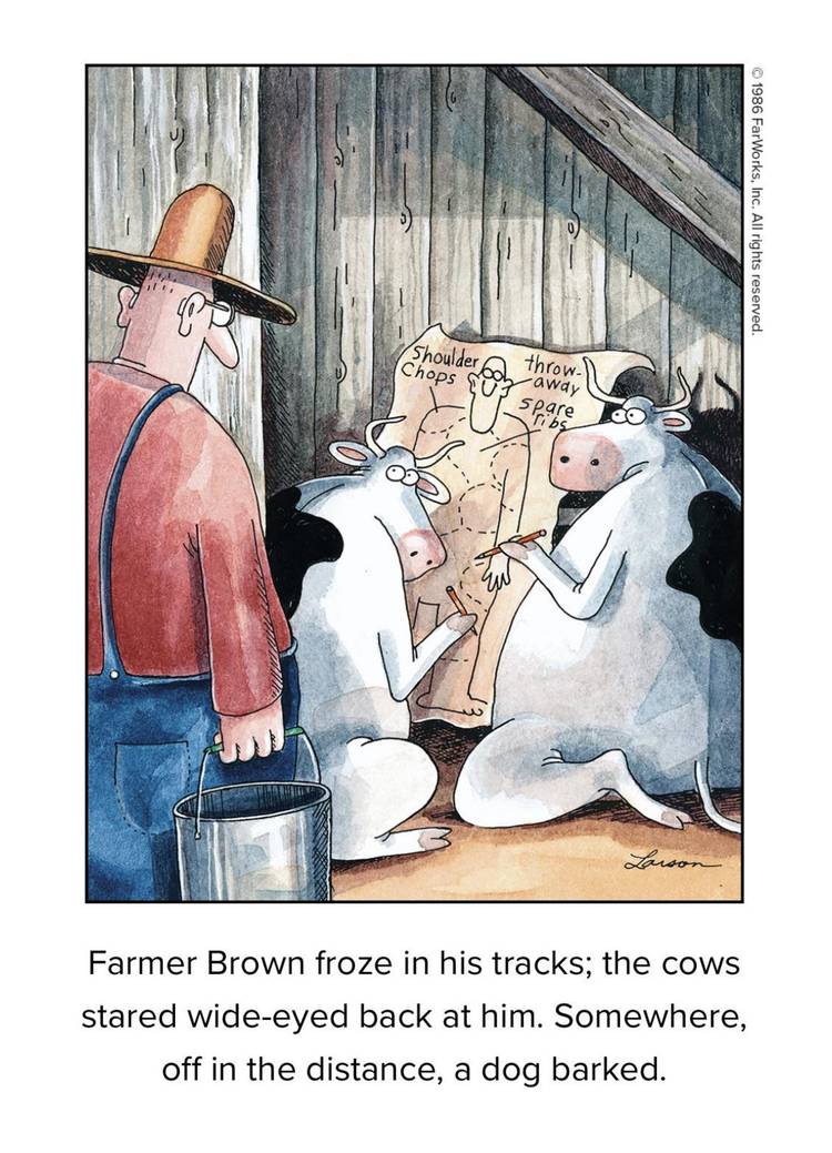 El lado lejano tiene la costumbre de ponerse un poco morboso, aunque esa morbilidad es un aspecto querido del sentido del humor de la franja. Esa sensibilidad macabra es muy evidente con un animal poco probable, como se ve en esta tira cómica de la granja. Dos vacas quedan atrapadas en un momento extremadamente inoportuno. Están repasando los mejores cortes de carne de agricultor Justo cuando su agricultor, Farmer Brown, entra y lo ve todo.