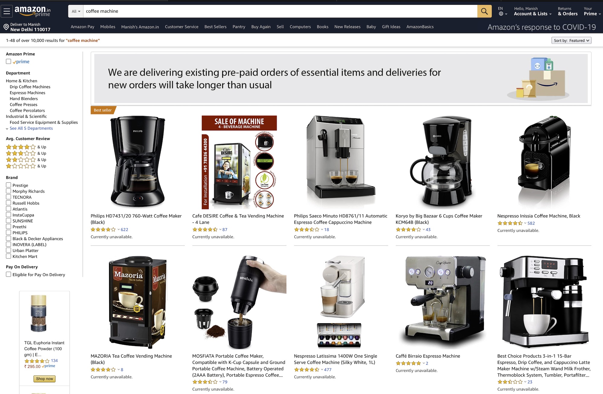 Una mirada al sitio web de Amazon India donde la mayoría de los artículos no están disponibles actualmente para la compra