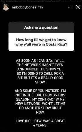 Recientemente, Bobby publicó una respuesta a una historia de Instagram en la que previamente les dijo a sus seguidores que “háganme una pregunta”. Un seguidor preguntó por qué Bobby estaba en Costa Rica y explicó que estaba filmando un programa que aún no se ha anunciado. Además, Bobby abordó los rumores de que no volvería a idolo Americano, confirmando que son verdaderas: “… Y algunos de ustedes lo notaron. No estoy en las promociones de Idol esta temporada. Mi contrato con mi nueva red no me deja hacer otro programa en este momento. Love Idol. POR CIERTO. Fueron 4 años geniales.“