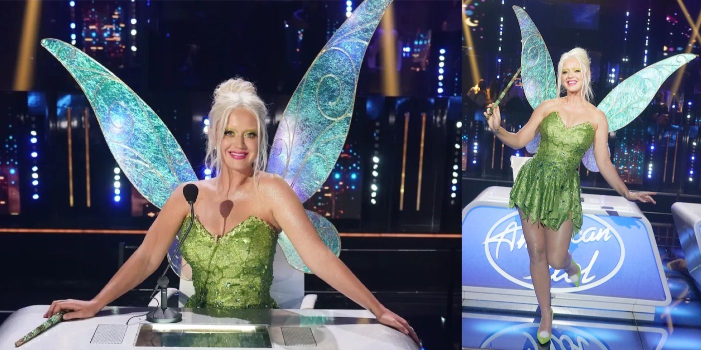 “/> idolo Americano La temporada 19 regresó triunfalmente al estudio cuando los artistas pudieron volver a cantar para el público en vivo. Katy hizo realidad los deseos de todos con su disfraz de Tinker Bell, el hada de Peter Pan. Llevaba un vestido corto de color verde lima brillante con un bolso y zapatos a juego. También tenía alas de hada iridiscentes y llevaba una varita mágica. Con su cabello rubio y orejas puntiagudas, Katy parecía Campanilla. Hizo que la noche fuera tan mágica que todos sintieron como si el teatro hubiera sido rociado con polvo de hadas.