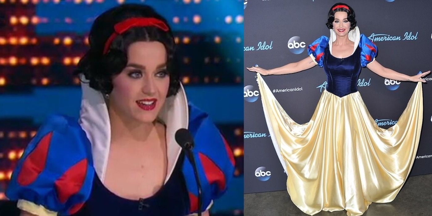 “/> Durante la primera idolo Americano Noche de Disney, Katy se vistió como Blancanieves, luciendo su icónico vestido con mangas abullonadas azules y rojas y una falda larga amarilla. Katy usó una peluca negra para el cabello negro de Blancanieves, completa con su característica diadema roja. También tenía el cuello alto y los labios rojos de Blancanieves. A lo largo del episodio, asumió la personalidad de Blancanieves, hablando con su voz dulce y aguda.