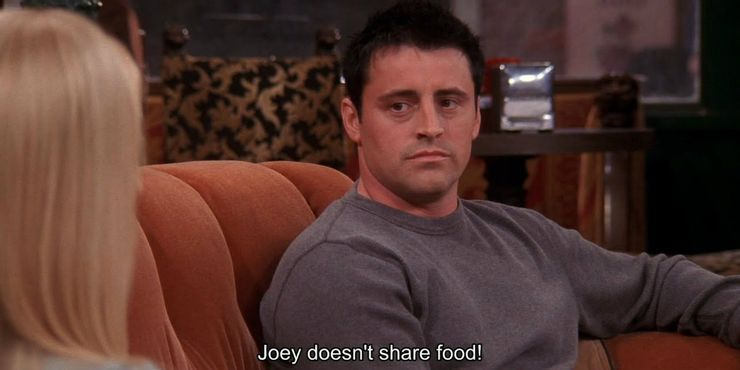 Esta cita es todo para todos los amantes de la comida. Podría decirse que Joey se volvió más infantil a medida que avanzaba el espectáculo, y esto afectó su antiguo amor por la comida. Se queja de que una cita le quitó algunas papas fritas de su plato, y cuando Phoebe pregunta por qué es un problema, Joey responde con la cita antes mencionada. Claro, tal vez sea un sentimiento egoísta, pero seguro que es divertido.