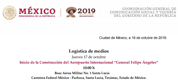 En una invitación a la prensa, el gobierno del presidente Andrés Manuel López Obrador dio a conocer la logística que se desarrollará este jueves 17 de octubre para dar el anuncio oficial del inicio a la construcción de la terminal aérea, por lo que se citó a los medios de comunicación a las 8:15 horas en el Zócalo con el fin de trasladarlos a Santa Lucía.