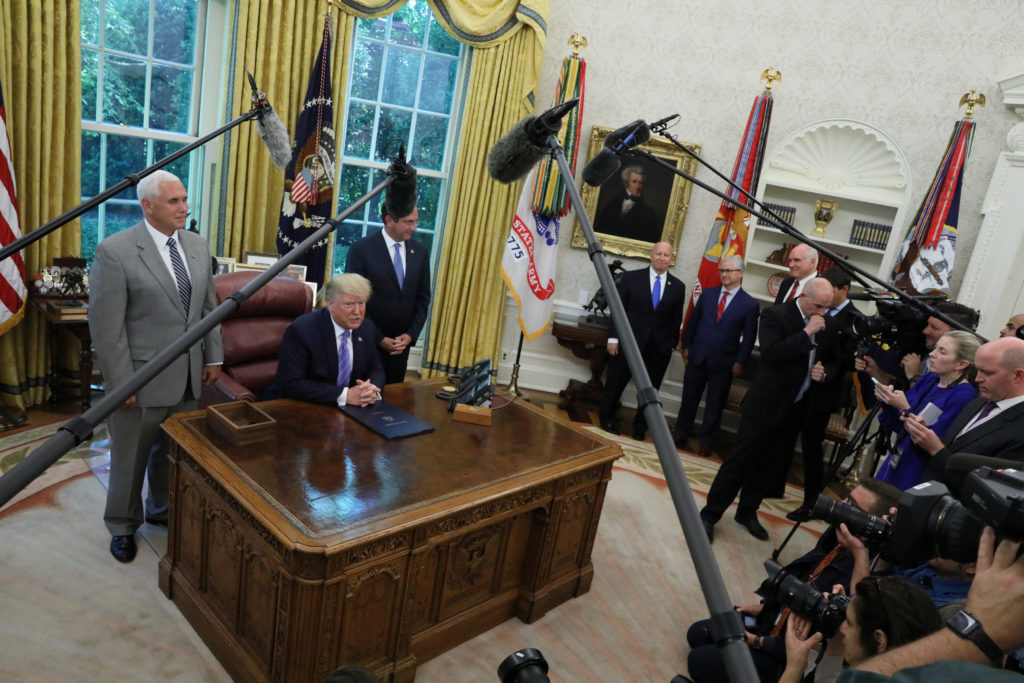 En la ceremonia realizada en la Oficina Oval, el jefe de la Casa Blanca estuvo acompañado por el vicepresidente Mike Pence y el secretario de Salud, Alex Azar.