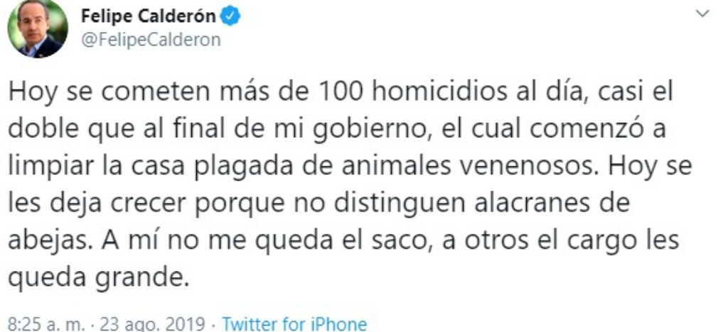 El ex presidente Felipe Calderón le contestó que “hoy se cometen más de 100 homicidios al día, casi el doble que al final de mi gobierno, el cual comenzó a limpiar la casa plagada de animales venenosos. Hoy se les deja crecer porque no distinguen alacranes de abejas. A mí no me queda el saco, a otros el cargo les queda grande“.
