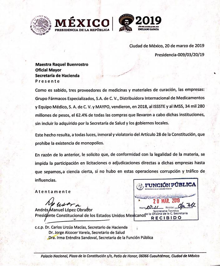 El presidente Andrés Manuel López Obrador envió un oficio a Raquel Buenrostro, Oficial Mayor de la Secretaría de Hacienda, para que se impida la participación en licitaciones o adjudicaciones directas a tres empresas proveedoras de medicinas y materiales de curación por posibles actos de corrupción o tráfico de influencias.