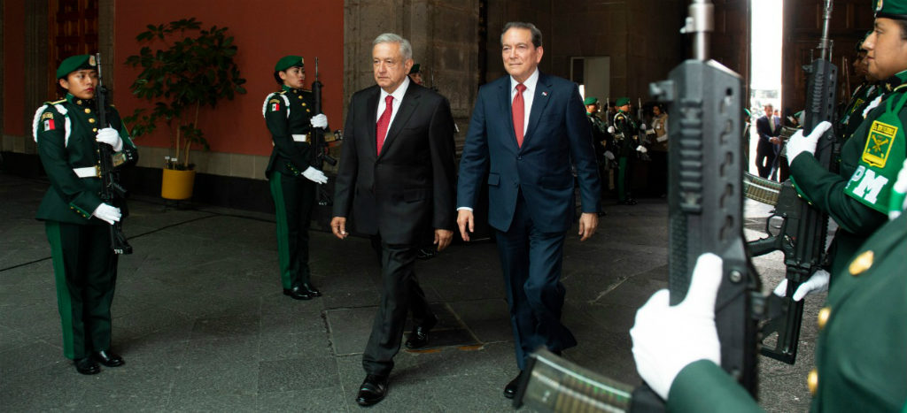 Los jefes de Estado y sus comitivas escucharon los himnos nacionales de los dos países flanqueados por las banderas de México y Panamá para después trasladarse a las oficinas del López Obrador para una diálogo privado.