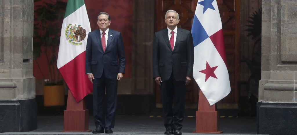 Los jefes de Estado y sus comitivas escucharon los himnos nacionales de los dos países flanqueados por las banderas de México y Panamá para después trasladarse a las oficinas del López Obrador para una diálogo privado.