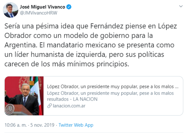 Vivanco acompañó su mensaje en Twitter con una nota de el portal La Nación en la que se apunta que el presidente de México “llevó a la izquierda al poder con un fuerte mandato popular para llevar adelante una transformación radical en la segunda economía de América latina“.