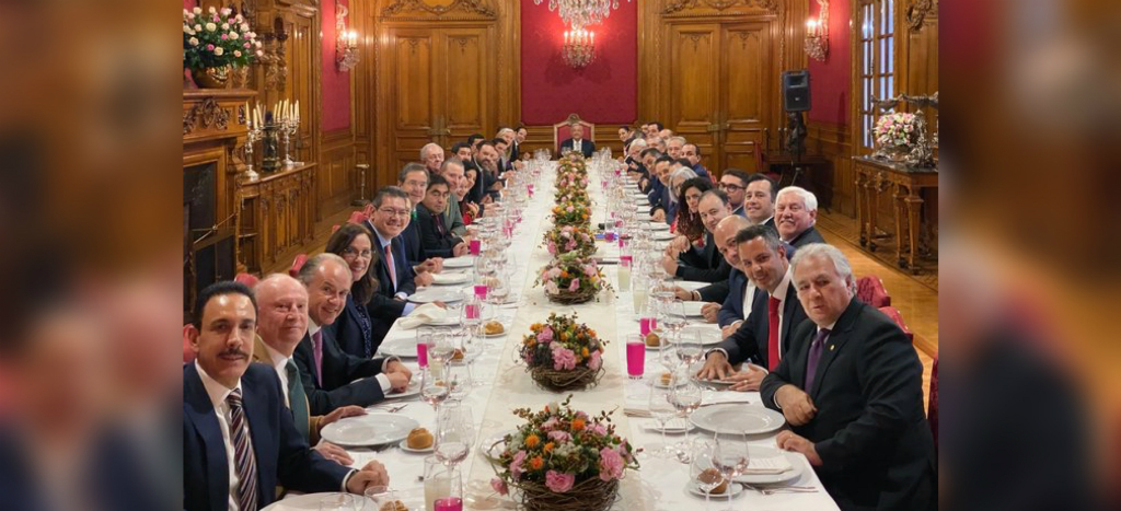 El presidente López Obrador publicó en redes sociales la imagen de la comida que ofreció a gobernadores e integrantes de su gabinete en Palacio Nacional.