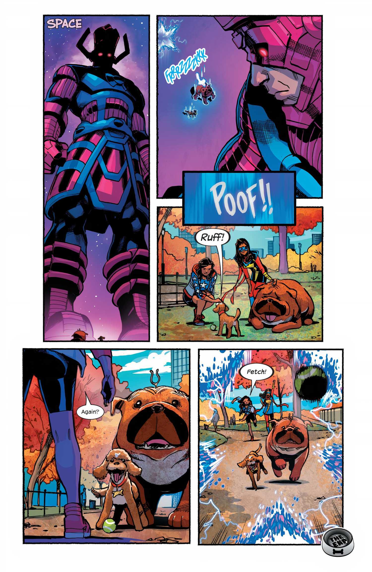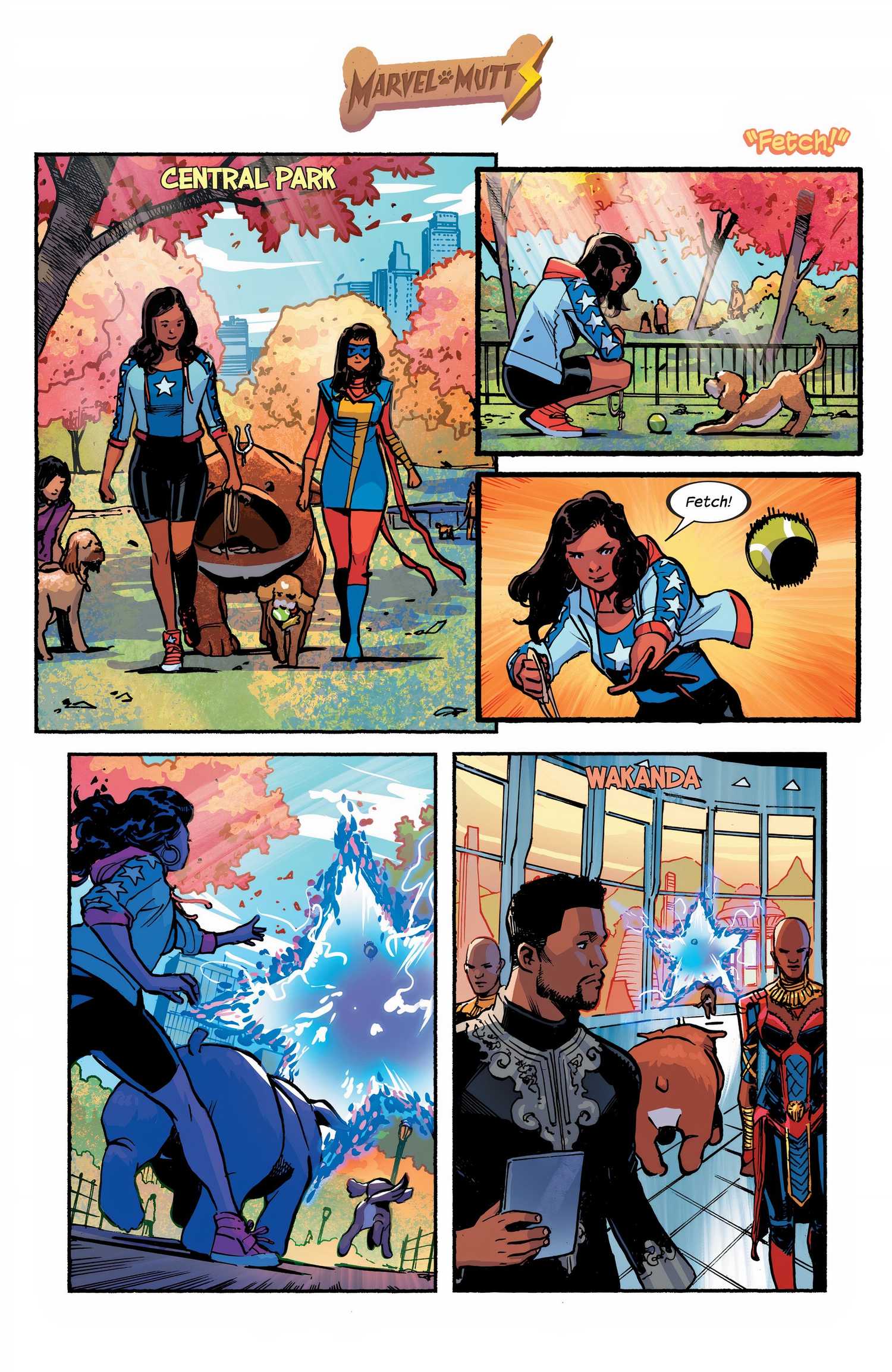 “Fetch” es una de las muchas historias deliciosas que aparecen en Marvel Mutts #1, que fue escrito por Mackenzie Cadenhead y dibujado por Takeshi Miyazawa. Mittens, un ex perro de refugio rescatado por la Sra. Marvel, se ha hecho amigo de los diversos perros súper potentes de Marvel, incluido Lockjaw. El dúo juega un juego de búsqueda que se extiende por la Tierra, pasando por Wakanda y el Edificio Baxter, entre otros.