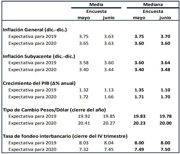 De acuerdo con la “Encuesta sobre las expectativas de los especialistas en economía del sector privado”, los expertos disminuyeron sus expectativas de inflación general para para este año a 3.63 por ciento en junio desde 3.75 por ciento en mayo, luego de dos meses al alza, y para 2020 también las recortaron a 3.63 por ciento desde 3.65 por ciento, tras el alza del mes previo.